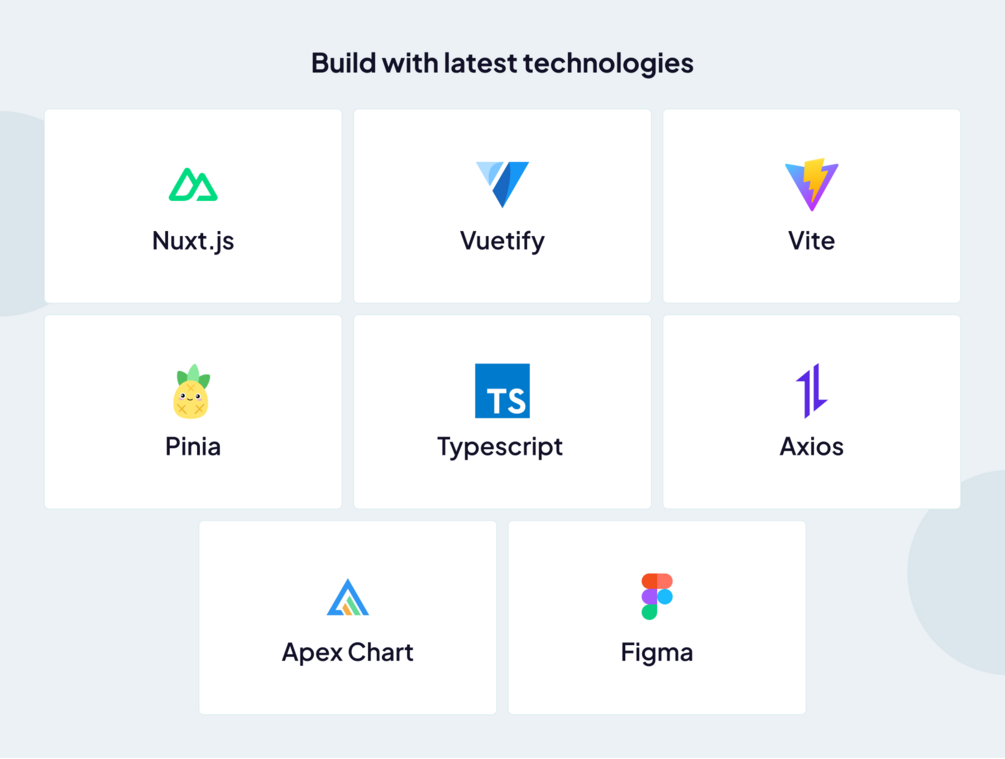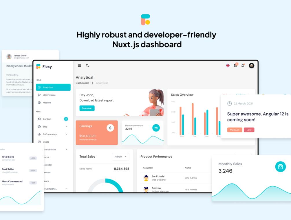 Checkout Live PreviewFlexy is a feature-packed admin template offering an aesthetically pleasing design built on Vuetify and Nuxt.js. It's designed for speed, efficiency, and ease of use, making it ideal for dashboards, CRM systems, and other web apps.