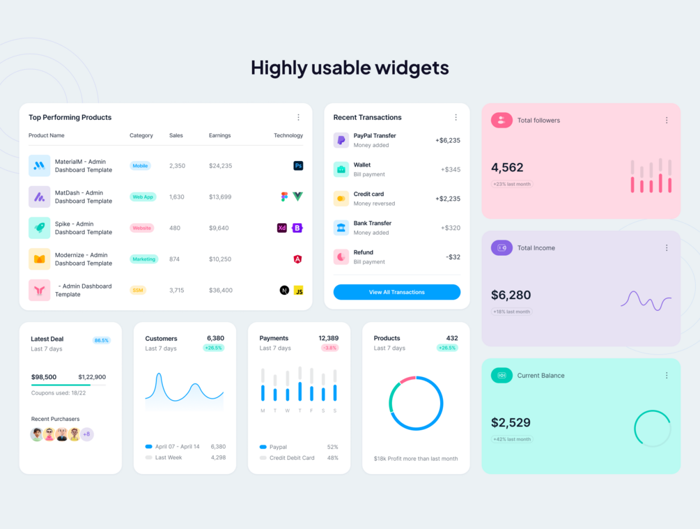 Built on Angular, MaterialM is optimized for performance and comes with highly flexible layouts, a modular design, and well-documented code that’s easy to understand and expand. It’s also packed with widgets, icons, and plugins to streamline project workflows and add unique customization options. Moreover, MaterialM includes dark mode and light mode options, making it easy for users to switch between themes depending on their preferences, enhancing user engagement.