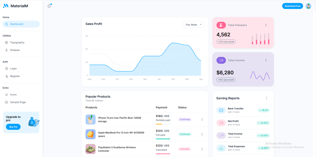 The template includes essential features like responsive design, customizable components, and well-structured code that’s easy to understand and extend. Whether you’re working on a personal project or a client’s application, MaterialM Free can help you kickstart development without worrying about designing from scratch.