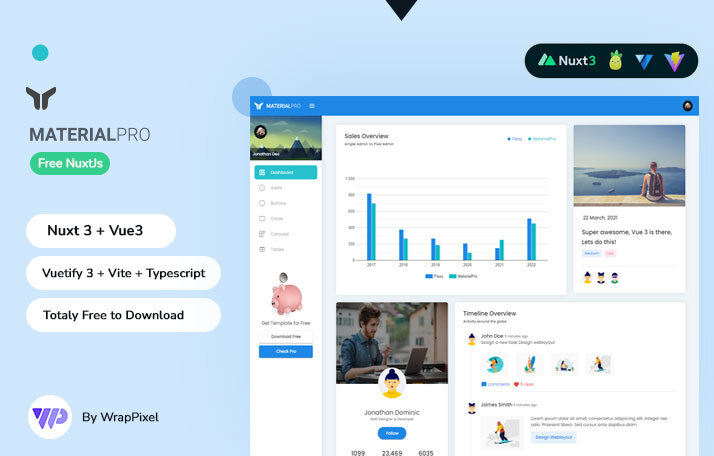 Checkout Live PreviewMaterialPro Free NuxtJS by WrapPixel is a modern admin dashboard template built with Nuxt.js 3 and Vue.js 3, featuring a responsive Material Design layout for quick and efficient project development. It is ideal for lightweight and professional web applications​ WRAPPIXEL