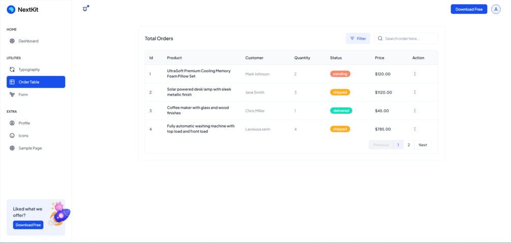 From UI to UX, NextKit follows a clean design language powered by Tailwind CSS, ensuring pixel-perfect layouts with high customizability. The codebase is clean, modular, and optimized for performance, giving developers a solid foundation to build and scale apps. Plus, with reusable components, form elements, charts, tables, and pages already baked in, you don’t have to build from scratch.