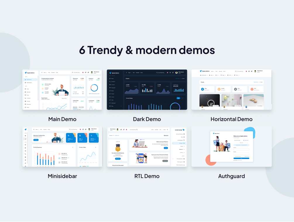 You can choose from 6 unique demos, each offering a distinct look and feel. These include a Minisidebar, Dark Theme, and RTL version.